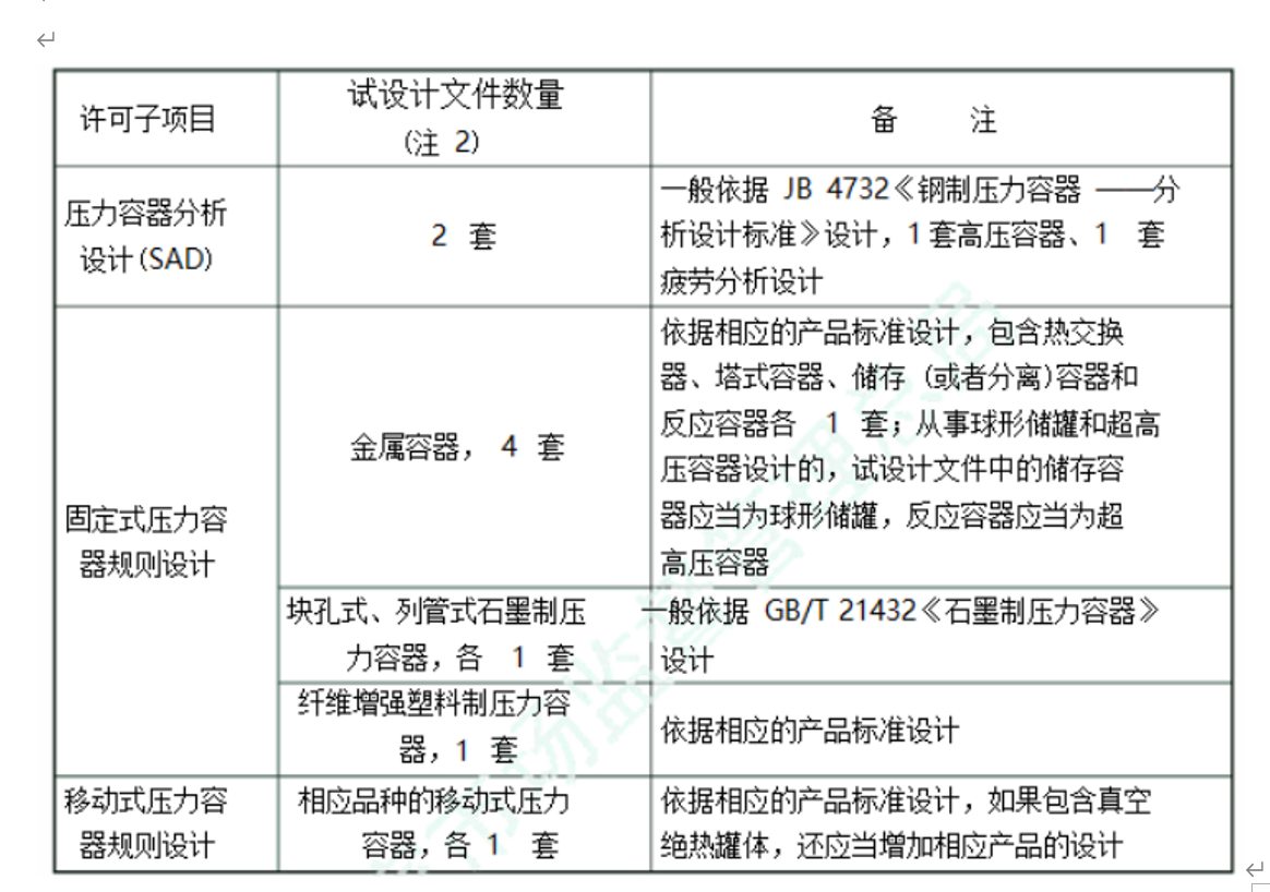 注2:申請固定式壓力容器規則設計 (金屬容器)的設計單位,提供的4套試設計文件中至少 1 套為第三類(lèi)壓力容器;制造單位進(jìn)行壓力容器設計的,試設計文件應當覆蓋其制造許可的設備品種范圍。