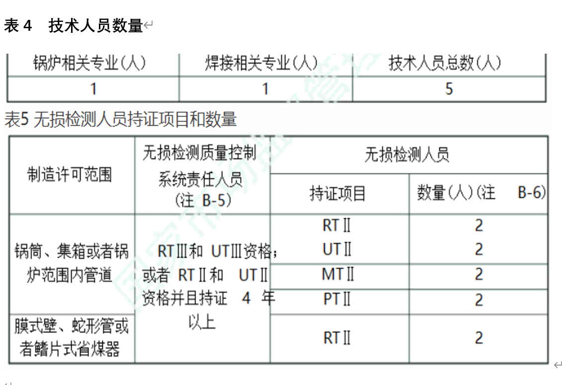 (2)無(wú)損檢測人員持證項目和數量應當符合表5的要求,制造 3 個(gè)以上A級部件單位的人員應當符合表2 中"A 級鍋爐"的要求;